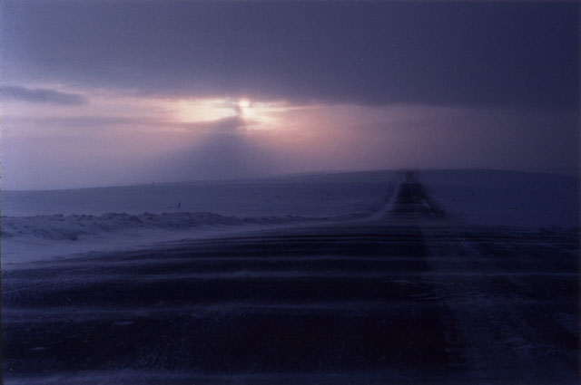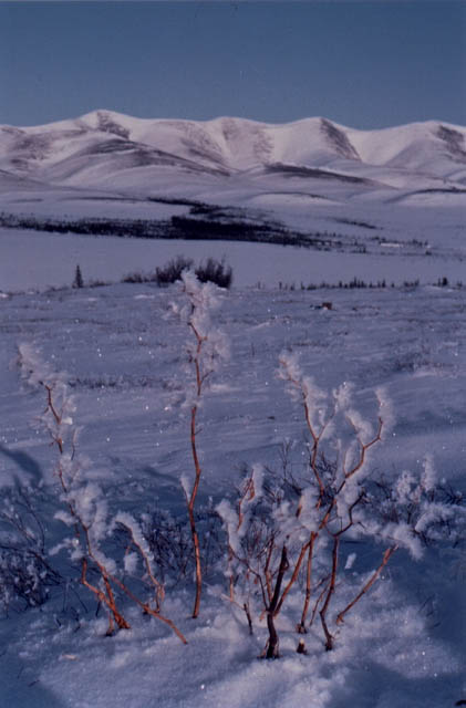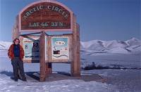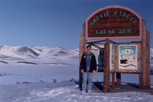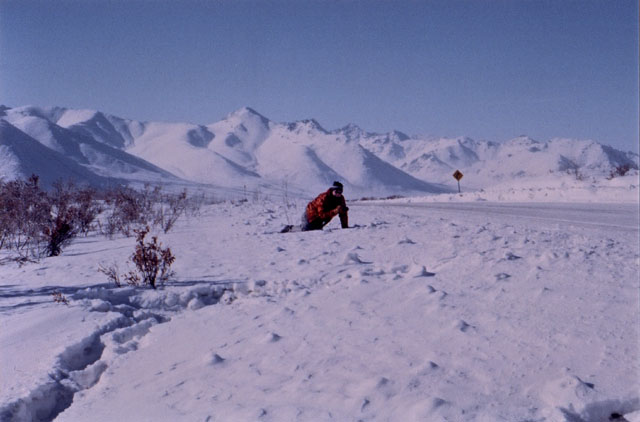 On March 23, 2002, a friend and I flew from Vancouver, British Columbia, to Whitehorse, Yukon Territory. We then spent the next week on a road trip from Whitehorse to Tukoyaktuk, Northwest Territories, on the Arctic Coast. March is still the end of winter up there, and the last 160 km (100 miles) were on the frozen Mackenzie River Delta and Arctic Ocean. Here's a map of the Dempster Highway and ice road.