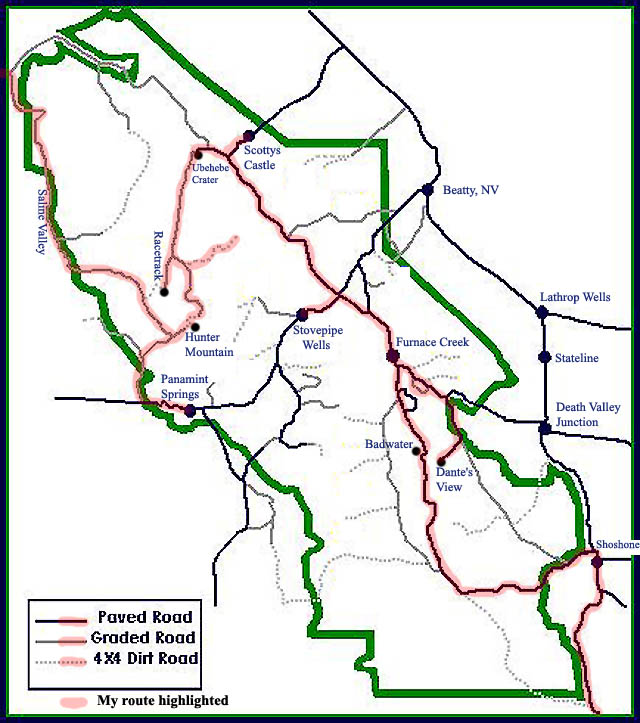 I've highlighted a map to show the route I took. The green area marks the boundary of the park. I came in from the southeast, from Baker, CA, on I-15. From Shoshone, I took Route 178 into the park and stopped at Badwater, 280 feet below sea-level. I then continued up 178 to Furnace Creek, the main visitors' center, where I camped the first night. The next morning I headed down Route 190, to Dante's View, then back to Furnace creek, stopping to take the loop through Twenty Mule Team Canyon on the way. From Furnace Creek I went up to Stovepipe Wells, another visitors' center, and then to Scottys Castle. After stopping at Scottys Castle, I was off to Ubehebe Crater, a volcanic crater, then The Racetrack, a dry lake. After bactracking some from The Racetrack, I headed for Hunter Mountain, with a couple side trips along the way. I camped at the top of the pass on Hunter Mountain, and was off to Panamint Springs for gas the next morning. Then it was back towards Hunter Mountain, but this time I turned north and left the park through Saline Valley, a remote area, similar to Death Valley, where I went 80 miles in 4 hours, without seeing another person. From the end of the highlighting I headed west into Big Pine, CA, on US Route 395. The scenery on the trip was incredible, and in June there were very few people around, especially off the main, paved highways. Distances by road: 18 miles from Badwater to Furnace Creek, 24 miles from Furnace Creek to Stovepipe Wells, 42 miles from Stovepipe Wells to Scottys Castle, 37 miles from Ubehebe Crater to Hunter Mountain, and 90 miles from Panamint Springs through, Saline Valley, to the junction with Big Pine Road (at the edge of map, where highlighting ends).