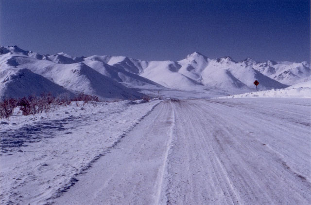 On March 23, 2002, a friend and I flew from Vancouver, British Columbia, to Whitehorse, Yukon Territory. We then spent the next week on a road trip from Whitehorse to Tukoyaktuk, Northwest Territories, on the Arctic Coast. March is still the end of winter up there, and the last 160 km (100 miles) were on the frozen Mackenzie River Delta and Arctic Ocean. Here's a map of the Dempster Highway and ice road.